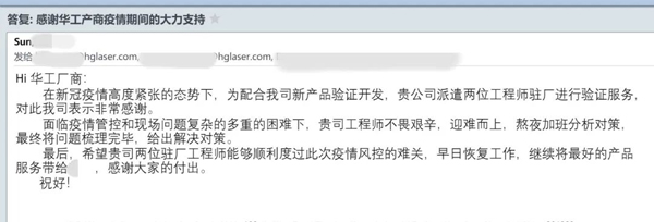 近期,全國(guó)多省份、多起疫情同時(shí)發(fā)生,牽動(dòng)人心。華工激光在特殊時(shí)期仍保持著高效優(yōu)質(zhì)的服務(wù),一封封來自各地客戶的感謝信是客戶對(duì)我們的贊許與肯定!